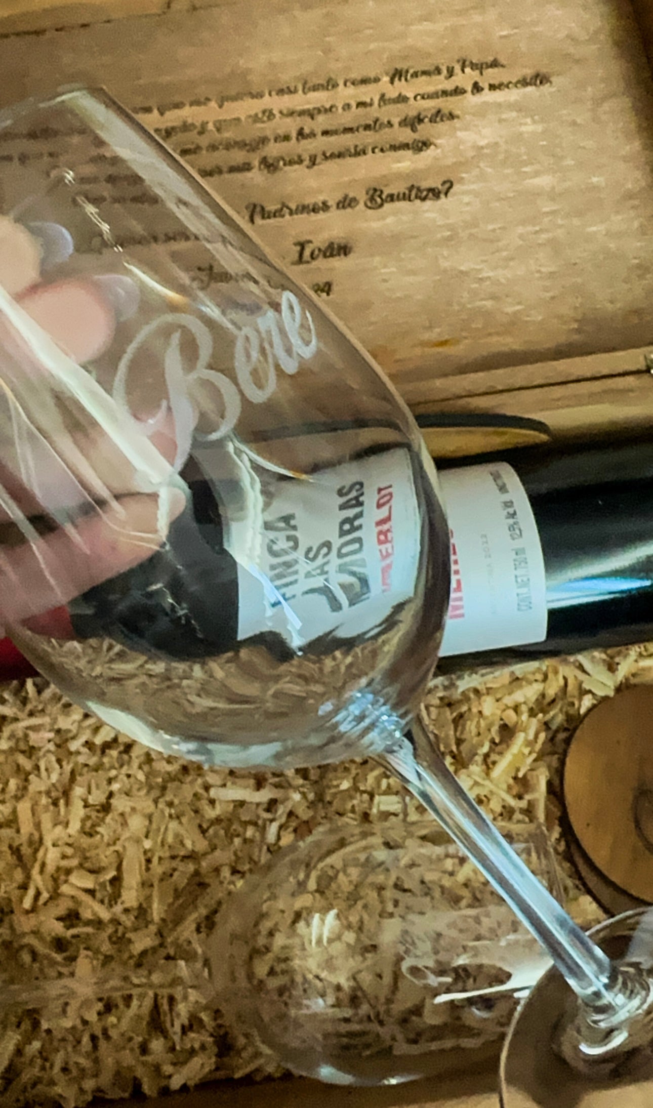 Incluye: grabados de textos tanto por la parte de afuera como por la parte de adentro de tu caja. Por ejemplo, puedes personalizarlo por la parte de afuera con el nombre o iniciales de los padrinos y por la parte de adentro alguna frase. Te incluye 1 botella de vino "Finca las Moras" o "La Cetto"; 2 copas (las cuáles pueden ir grabadas con el nombre de los padrinos cada una); 2 porta vasos grabados; 1 porta copas; y 1 sacacorchos.