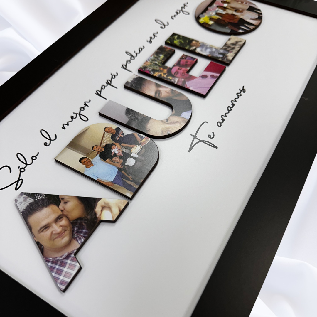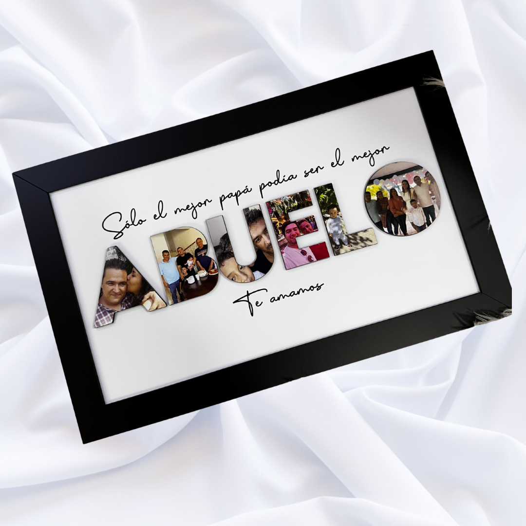 Da vida a su espacio con este elegante y exclusivo cuadro 3D de la palabra ABUELO. Cada letra personalizada con una fotografía, añade un toque único y funcional a la decoración. El regalo perfecto para expresar tu amor de una manera bella y sofisticada. ¡Listo para colgar en su pared favorita!