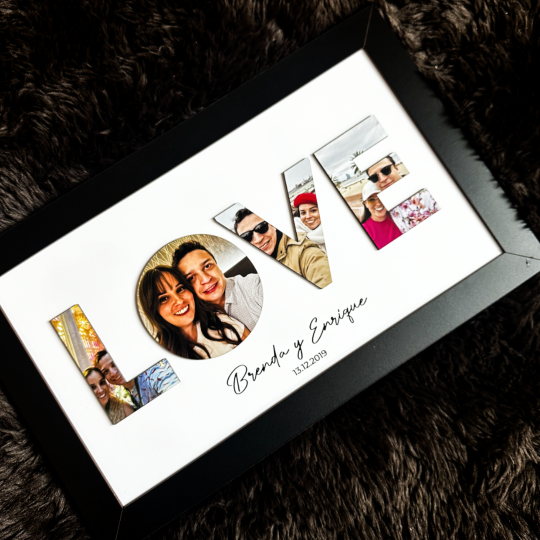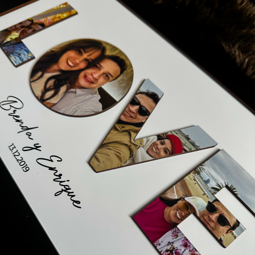 Da vida a su espacio con este elegante y exclusivo cuadro 3D de la palabra LOVE. Cada letra personalizada con una fotografía, añade un toque único y funcional a la decoración. El regalo perfecto para expresar su amor de una manera bella y sofisticada. ¡Listo para colgar en su pared favorita!