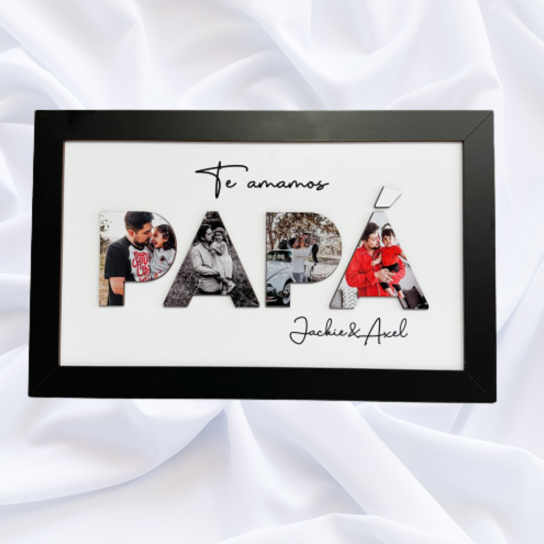 Da vida a su espacio con este elegante y exclusivo cuadro 3D de la palabra PAPÁ. Cada letra personalizada con una fotografía, añade un toque único y funcional a la decoración. El regalo perfecto para expresar tu amor de una manera bella y sofisticada. ¡Listo para colgar en su pared favorita!