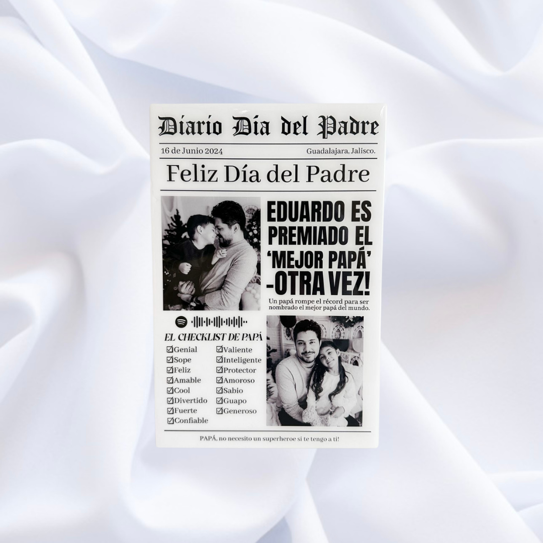Sorprende a papá con este elegante cuadro personalizado de resina, diseñado con estilo de periódico en español. Un regalo único que puedes personalizar con su nombre, fotos especiales y hasta un código Spotify que enlace a su música favorita. La decoración perfecta para su espacio personal que combinará estilo y sentimiento. ¡Haz que este Día del Padre sea inolvidable con un detalle que apreciará todos los días!