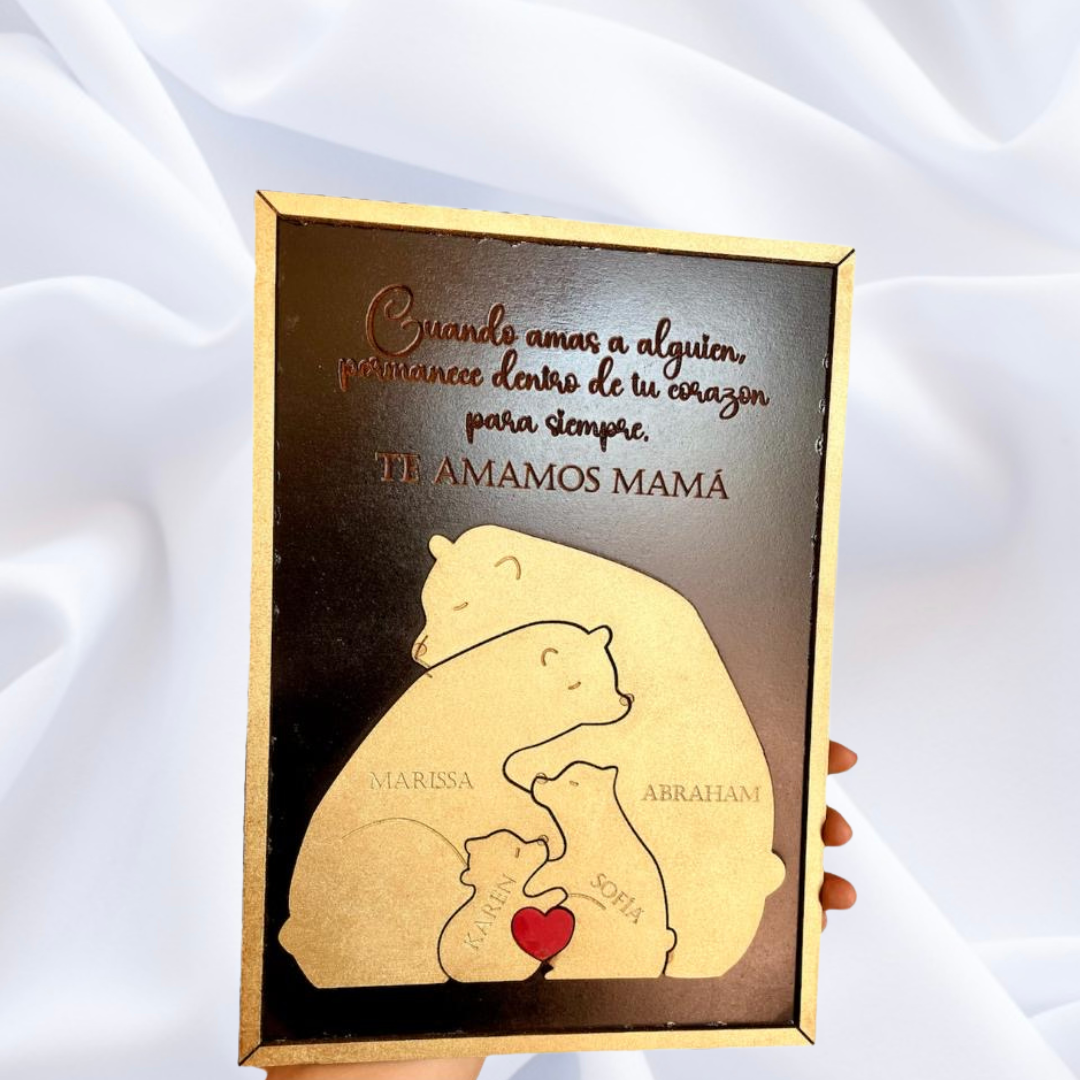 Descubre el amor encajando cada pieza de nuestro cuadro rompecabezas osos personalizado. Con hasta 9 ositos, representa cada miembro de la familia en una linda figura abrazada. Personaliza el cuadro con una frase emotiva para regalar a mamá y darle un toque de elegancia a su hogar.