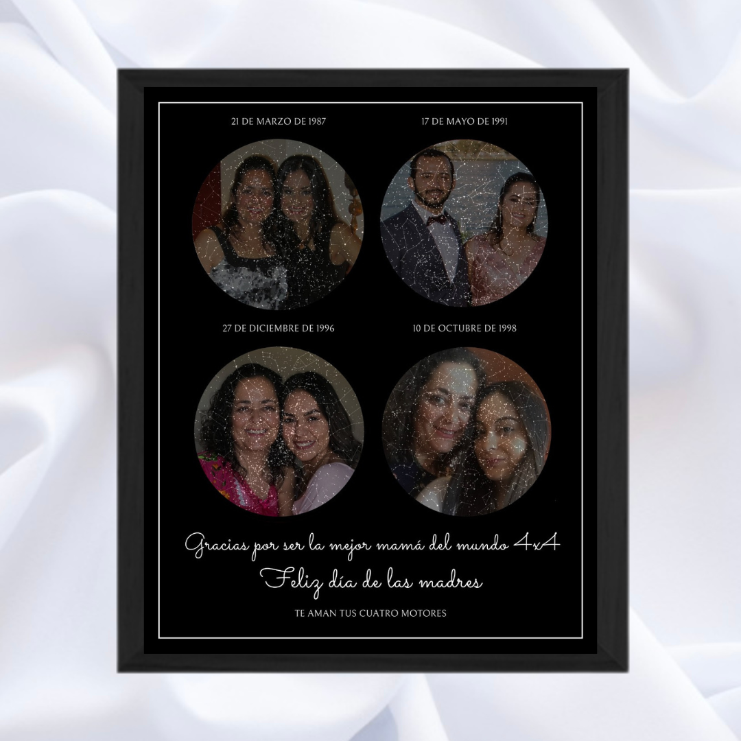 Celebra a mamá con este regalo único y especial. El mapa estelar incluye las fechas de nacimiento tuya y 3 fechas (hermanos, fecha de papás, de abuelos), con fotos personalizadas. Un recordatorio de su amor y apoyo, y cómo las estrellas estaban alineadas en momentos clave de sus vidas. Un regalo excepcional para su cumpleaños, Día de la Madre o cualquier ocasión especial. Personalízalo con frases, nombres o iniciales y/o con algún código de Spotify o QR que enlace a su canción favorita, ...éste regalo es ideal para revivir recuerdos únicos. Listo para regalar y enmarcar en tu espacio favorito.