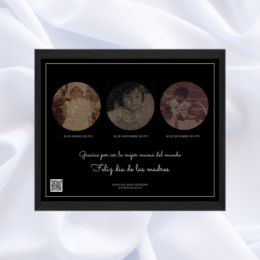 Celebra a mamá con este regalo único y especial. El mapa estelar incluye las fechas de nacimiento de 3 miembros de la familia, con fotos personalizadas. Un recordatorio de su amor y apoyo, y cómo las estrellas estaban alineadas en momentos clave de sus vidas. Un regalo excepcional para su cumpleaños, Día de la Madre o cualquier ocasión especial. Personalízalo con frases, nombres o iniciales y/o con algún código de Spotify o QR que enlace a su canción favorita, ...éste regalo es ideal para revivir recuerdos únicos. Listo para regalar y enmarcar en tu espacio favorito.